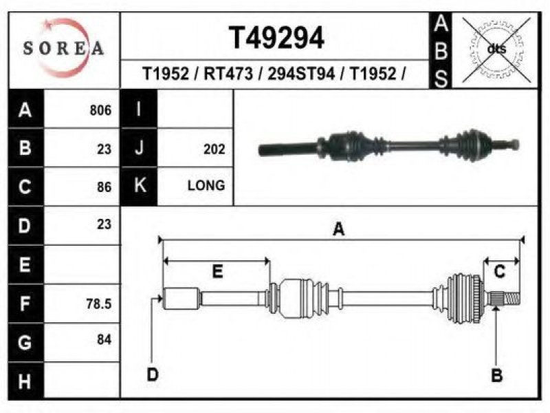 ilgis [mm]: 806 išorinis krumplys, rato pusė: 23 skersmuo 1 [mm]: 84 išorinis krumplys. kt. pusė: 23 skersmuo 2 [mm]: 78,5 stabdymas / važiavimo dinamika: transporto priemonėms su ABS kardaninis velenas: be ABS žiedo |