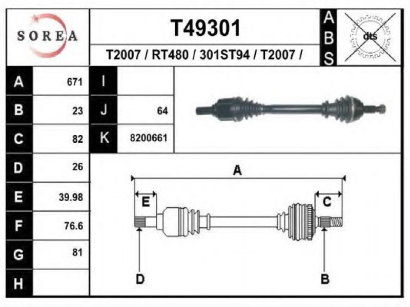 ilgis [mm]: 671 išorinis krumplys, rato pusė: 23 skersmuo 1 [mm]: 81 išorinis krumplys. kt. pusė: 26 skersmuo 2 [mm]: 76,6 stabdymas / važiavimo dinamika: transporto priemonėms su ABS kardaninis velenas: be ABS žiedo |