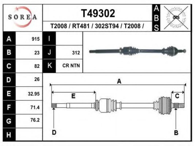 ilgis [mm]: 915 išorinis krumplys, rato pusė: 23 skersmuo 1 [mm]: 76,2 išorinis krumplys. kt. pusė: 26 skersmuo 2 [mm]: 71,4 stabdymas / važiavimo dinamika: transporto priemonėms su ABS kardaninis velenas: be ABS žiedo |