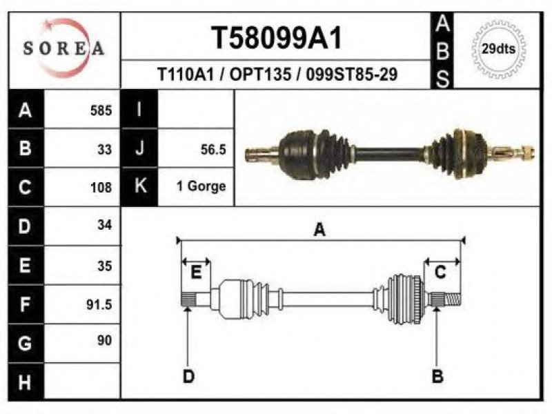 ilgis [mm]: 585 išorinis krumplys, rato pusė: 33 skersmuo 1 [mm]: 90 išorinis krumplys. kt. pusė: 34 skersmuo 2 [mm]: 91,5 krumplių skaičius, ABS žiedas: 29 stabdymas / važiavimo dinamika: transporto priemonėms su ABS kardaninis velenas: su ABS žiedu |