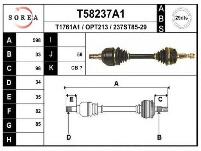 ilgis [mm]: 598 išorinis krumplys, rato pusė: 33 skersmuo 1 [mm]: 85 išorinis krumplys. kt. pusė: 34 skersmuo 2 [mm]: 82 krumplių skaičius, ABS žiedas: 29 stabdymas / važiavimo dinamika: transporto priemonėms su ABS kardaninis velenas: su ABS žiedu |