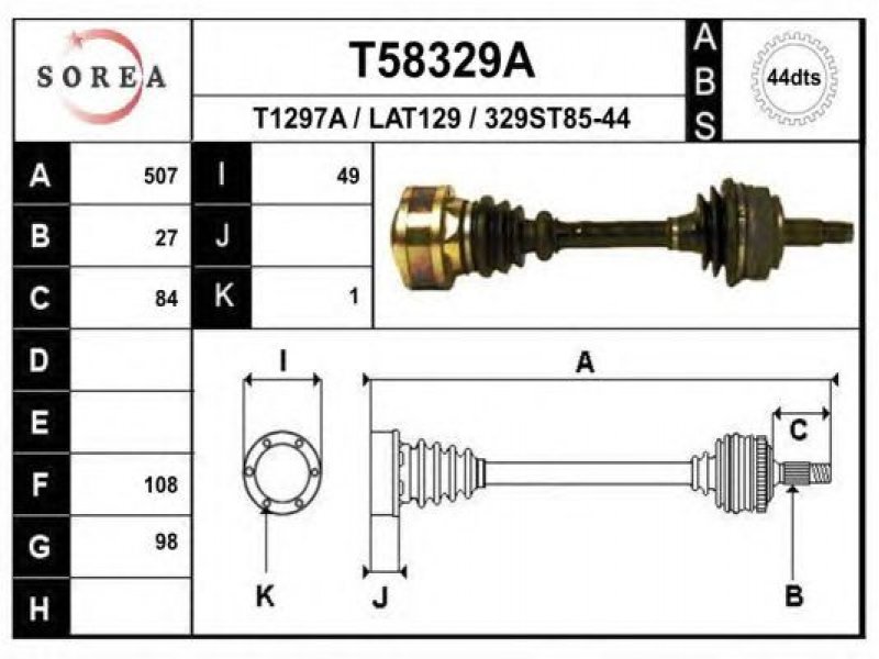 ilgis [mm]: 507 išorinis krumplys, rato pusė: 27 skersmuo 1 [mm]: 98 skersmuo 2 [mm]: 108 krumplių skaičius, ABS žiedas: 44 stabdymas / važiavimo dinamika: transporto priemonėms su ABS kardaninis velenas: su ABS žiedu |