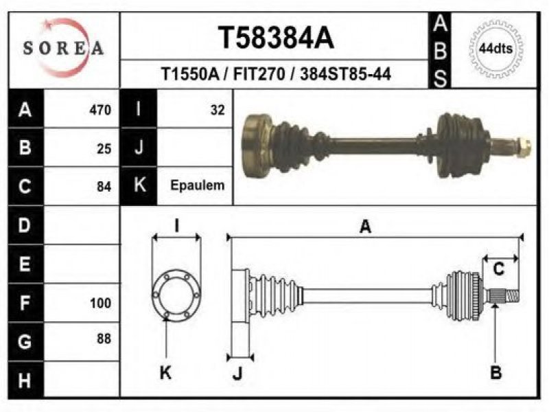 ilgis [mm]: 470 išorinis krumplys, rato pusė: 25 skersmuo 1 [mm]: 88 skersmuo 2 [mm]: 100 krumplių skaičius, ABS žiedas: 44 stabdymas / važiavimo dinamika: transporto priemonėms su ABS kardaninis velenas: su ABS žiedu |