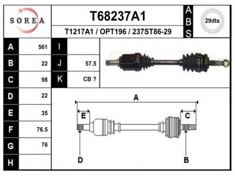 ilgis [mm]: 561 išorinis krumplys, rato pusė: 22 skersmuo 1 [mm]: 82 išorinis krumplys. kt. pusė: 22 skersmuo 2 [mm]: 79,5 krumplių skaičius, ABS žiedas: 29 stabdymas / važiavimo dinamika: transporto priemonėms su ABS kardaninis velenas: su ABS žiedu |