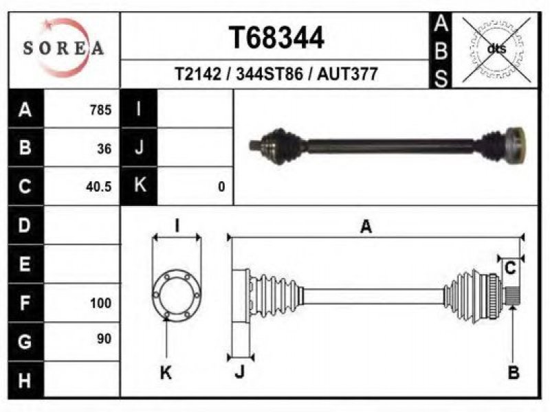 ilgis [mm]: 785 išorinis krumplys, rato pusė: 36 skersmuo 1 [mm]: 90 skersmuo 2 [mm]: 100 stabdymas / važiavimo dinamika: transporto priemonėms su ABS kardaninis velenas: be ABS žiedo |