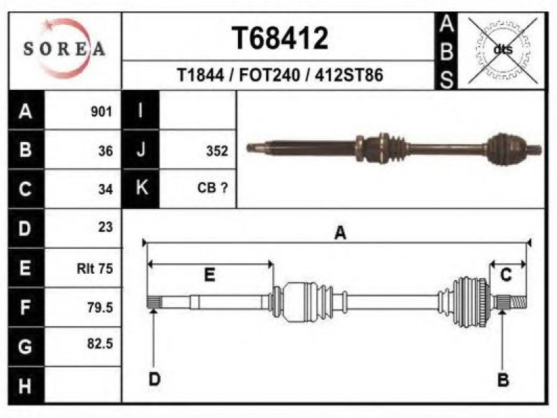 ilgis [mm]: 901 išorinis krumplys, rato pusė: 36 skersmuo 1 [mm]: 82,5 išorinis krumplys. kt. pusė: 23 skersmuo 2 [mm]: 79,5 stabdymas / važiavimo dinamika: transporto priemonėms su ABS kardaninis velenas: be ABS žiedo |