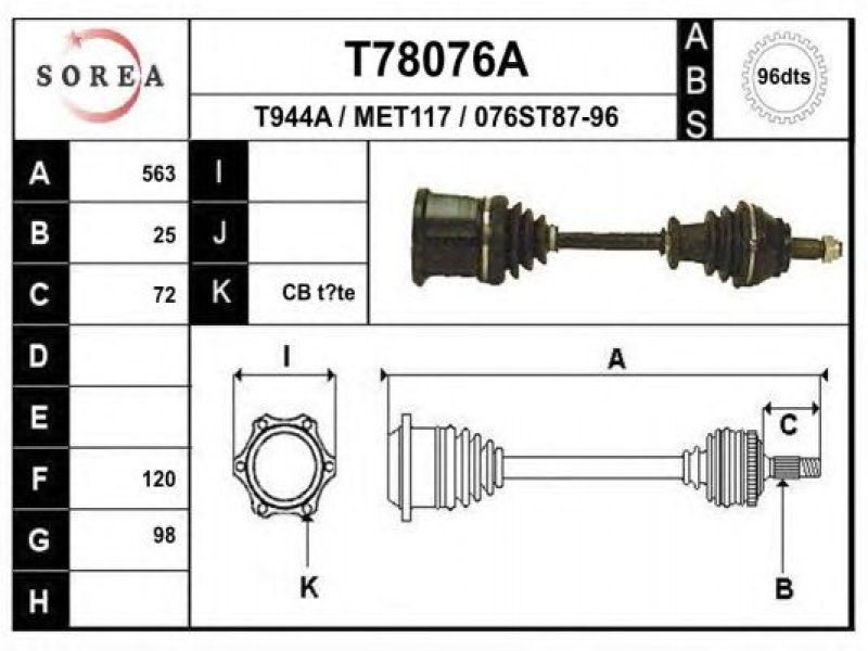 ilgis [mm]: 563 išorinis krumplys, rato pusė: 25 skersmuo 1 [mm]: 98 skersmuo 2 [mm]: 120 krumplių skaičius, ABS žiedas: 96 stabdymas / važiavimo dinamika: transporto priemonėms su ABS kardaninis velenas: su ABS žiedu |