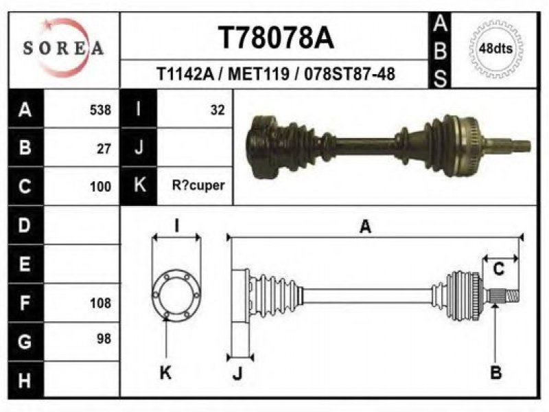 ilgis [mm]: 538 išorinis krumplys, rato pusė: 27 skersmuo 1 [mm]: 98 skersmuo 2 [mm]: 108 krumplių skaičius, ABS žiedas: 48 stabdymas / važiavimo dinamika: transporto priemonėms su ABS kardaninis velenas: su ABS žiedu |
