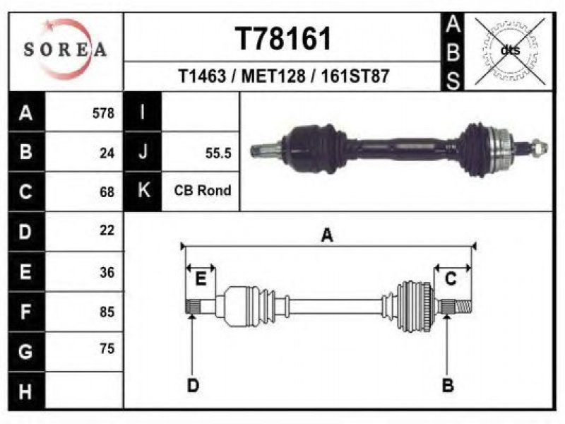 ilgis [mm]: 578 išorinis krumplys, rato pusė: 24 skersmuo 1 [mm]: 75 išorinis krumplys. kt. pusė: 22 skersmuo 2 [mm]: 85 stabdymas / važiavimo dinamika: transporto priemonėms be ABS |