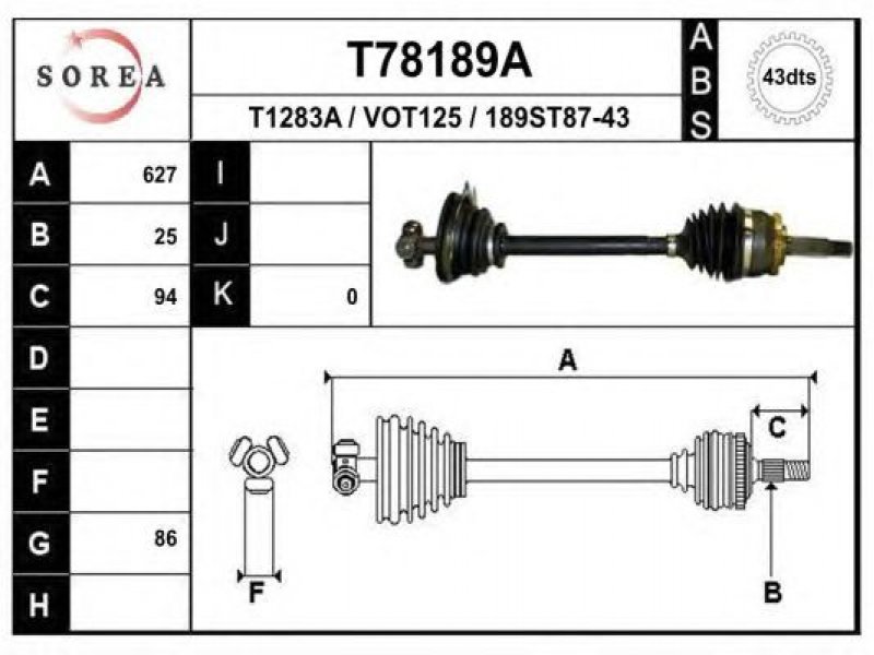 ilgis [mm]: 627 išorinis krumplys, rato pusė: 25 skersmuo 1 [mm]: 86 skersmuo 3 [mm]: 30 krumplių skaičius, ABS žiedas: 43 stabdymas / važiavimo dinamika: transporto priemonėms su ABS kardaninis velenas: su ABS žiedu |