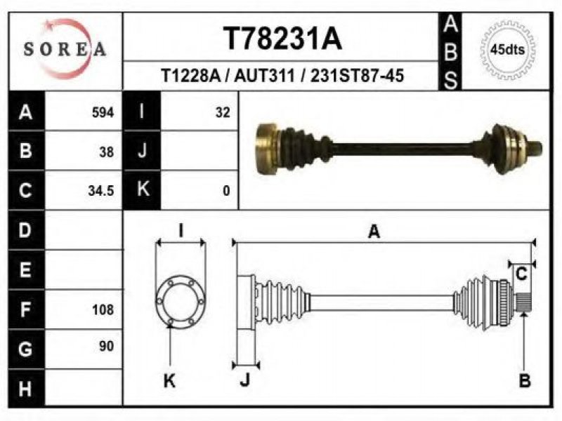 ilgis [mm]: 594 išorinis krumplys, rato pusė: 38 skersmuo 1 [mm]: 90 skersmuo 2 [mm]: 108 krumplių skaičius, ABS žiedas: 45 stabdymas / važiavimo dinamika: transporto priemonėms su ABS kardaninis velenas: su ABS žiedu |