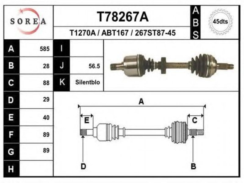 ilgis [mm]: 585 išorinis krumplys, rato pusė: 28 skersmuo 1 [mm]: 89 išorinis krumplys. kt. pusė: 29 skersmuo 2 [mm]: 89 krumplių skaičius, ABS žiedas: 45 stabdymas / važiavimo dinamika: transporto priemonėms su ABS kardaninis velenas: su ABS žiedu |