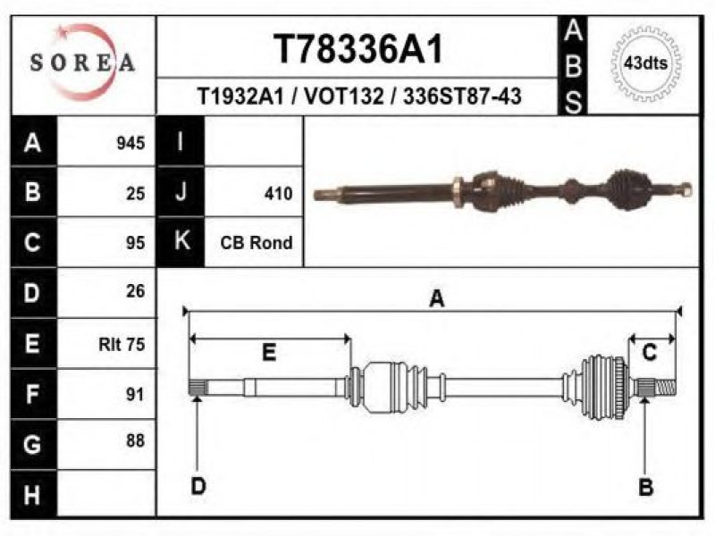 ilgis [mm]: 945 išorinis krumplys, rato pusė: 25 skersmuo 1 [mm]: 88 išorinis krumplys. kt. pusė: 26 skersmuo 2 [mm]: 91 krumplių skaičius, ABS žiedas: 43 stabdymas / važiavimo dinamika: transporto priemonėms su ABS kardaninis velenas: su ABS žiedu |
