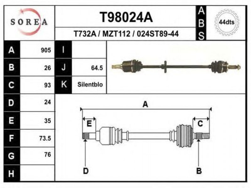 ilgis [mm]: 905 išorinis krumplys, rato pusė: 26 skersmuo 1 [mm]: 76 išorinis krumplys. kt. pusė: 24 skersmuo 2 [mm]: 73,5 krumplių skaičius, ABS žiedas: 44 stabdymas / važiavimo dinamika: transporto priemonėms su ABS kardaninis velenas: su ABS žiedu |