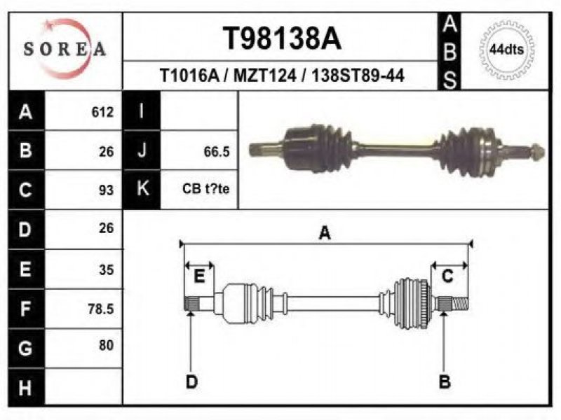 ilgis [mm]: 612 išorinis krumplys, rato pusė: 26 skersmuo 1 [mm]: 80 išorinis krumplys. kt. pusė: 26 skersmuo 2 [mm]: 78,5 krumplių skaičius, ABS žiedas: 44 stabdymas / važiavimo dinamika: transporto priemonėms su ABS kardaninis velenas: su ABS žiedu |