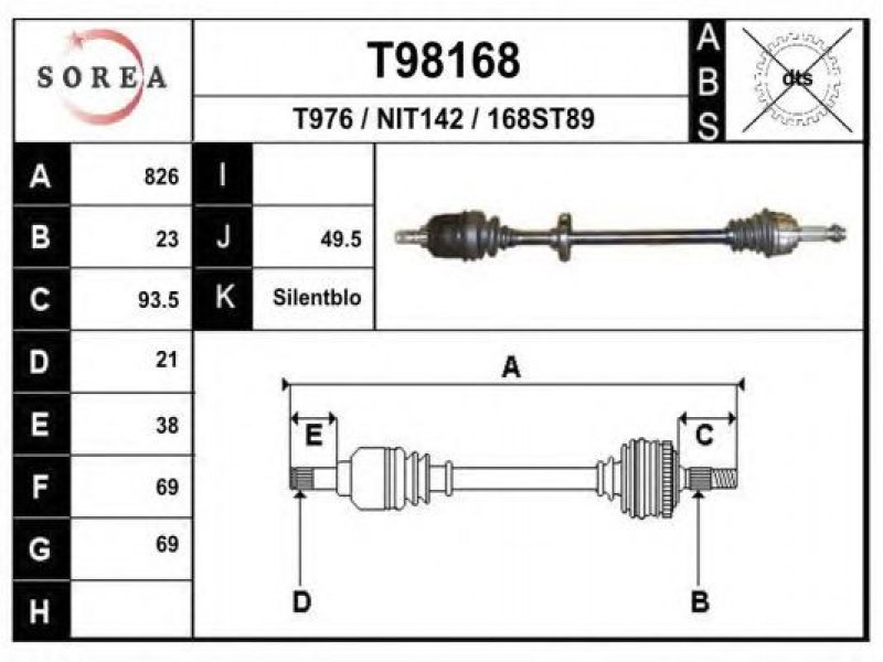 ilgis [mm]: 826 išorinis krumplys, rato pusė: 23 skersmuo 1 [mm]: 69 išorinis krumplys. kt. pusė: 21 skersmuo 2 [mm]: 69 stabdymas / važiavimo dinamika: transporto priemonėms be ABS |