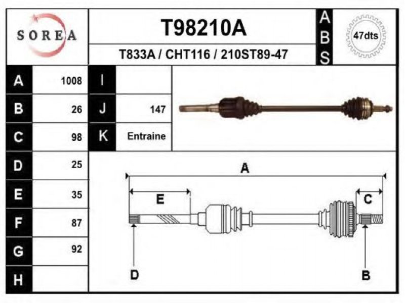 ilgis [mm]: 1008 išorinis krumplys, rato pusė: 26 skersmuo 1 [mm]: 92 išorinis krumplys. kt. pusė: 25 skersmuo 2 [mm]: 87 krumplių skaičius, ABS žiedas: 47 stabdymas / važiavimo dinamika: transporto priemonėms su ABS kardaninis velenas: su ABS žiedu |