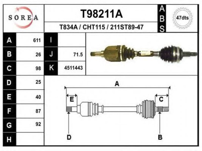 ilgis [mm]: 611 išorinis krumplys, rato pusė: 26 skersmuo 1 [mm]: 92 išorinis krumplys. kt. pusė: 25 skersmuo 2 [mm]: 87 krumplių skaičius, ABS žiedas: 47 stabdymas / važiavimo dinamika: transporto priemonėms su ABS kardaninis velenas: su ABS žiedu |
