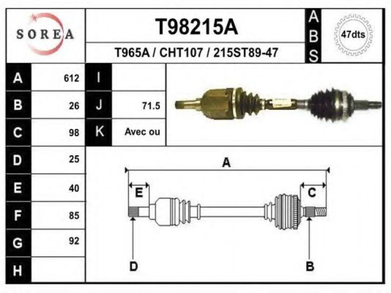 ilgis [mm]: 612 išorinis krumplys, rato pusė: 26 skersmuo 1 [mm]: 92 išorinis krumplys. kt. pusė: 25 skersmuo 2 [mm]: 85 krumplių skaičius, ABS žiedas: 47 stabdymas / važiavimo dinamika: transporto priemonėms su ABS kardaninis velenas: su ABS žiedu |