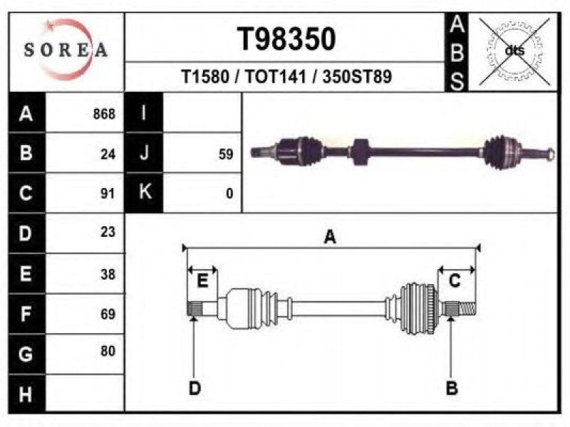 ilgis [mm]: 868 išorinis krumplys, rato pusė: 24 skersmuo 1 [mm]: 80 išorinis krumplys. kt. pusė: 23 skersmuo 2 [mm]: 70 stabdymas / važiavimo dinamika: transporto priemonėms be ABS |