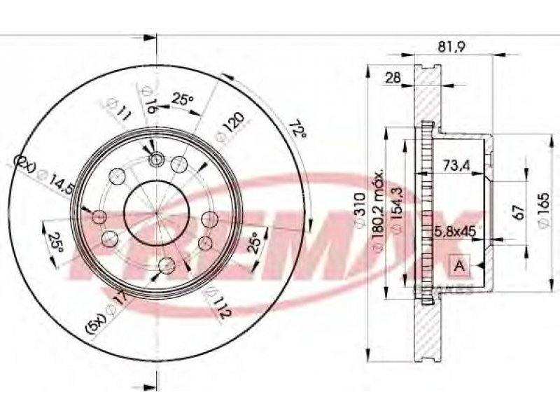 skersmuo [mm]: 310 stabdžių disko tipas: vidinis ventiliavimas stabdžių disko storis [mm]: 28 minimalus storis [mm]: 25,4 aukštis [mm]: 82 žiedų angų skaičius: 5 rato stebulės skersmuo [mm]: 67 užbaigimas: pastiprinta anglis |