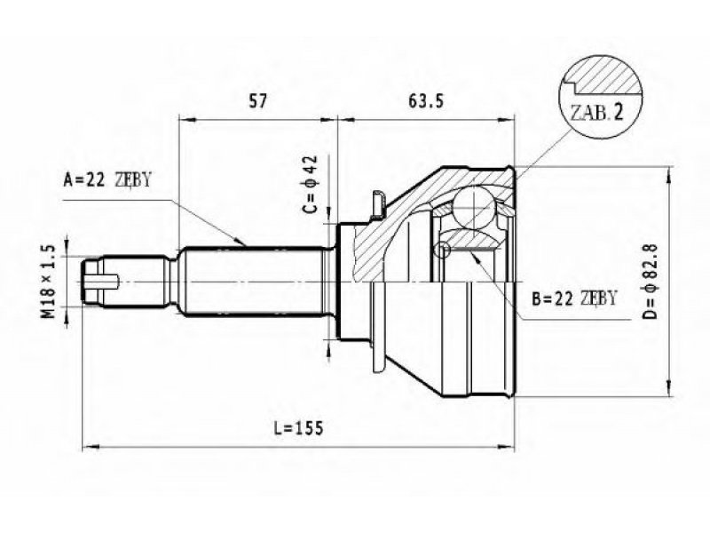 jungties tipas: CV sujungimas išorinis krumplys, rato pusė: 22 vidinis krumplys, rato pusė: 22 sandariklio skersmuo [mm]: 42 išorinis skersmuo [mm]: 82,8 |