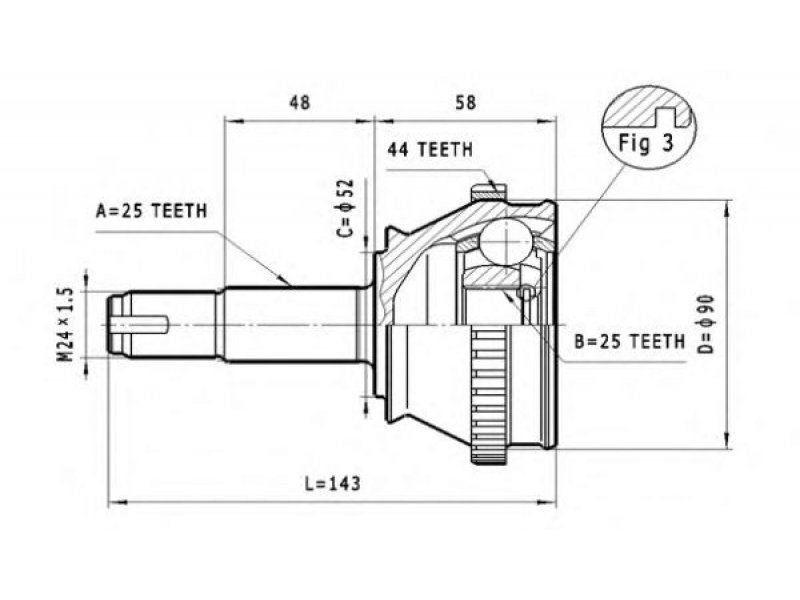 montavimo vieta: rato pusė jungties tipas: CV sujungimas išorinis krumplys, rato pusė: 25 vidinis krumplys, rato pusė: 25 sandariklio skersmuo [mm]: 52 išorinis skersmuo [mm]: 90 krumplių skaičius, ABS žiedas: 44 |
