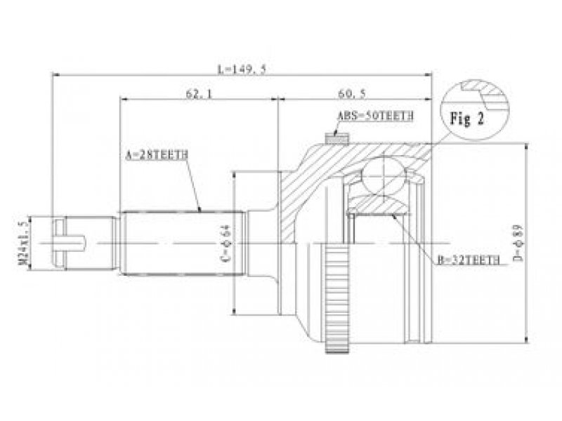 montavimo vieta: rato pusė jungties tipas: CV sujungimas išorinis krumplys, rato pusė: 28 vidinis krumplys, rato pusė: 32 sandariklio skersmuo [mm]: 64 išorinis skersmuo [mm]: 98 krumplių skaičius, ABS žiedas: 50 |