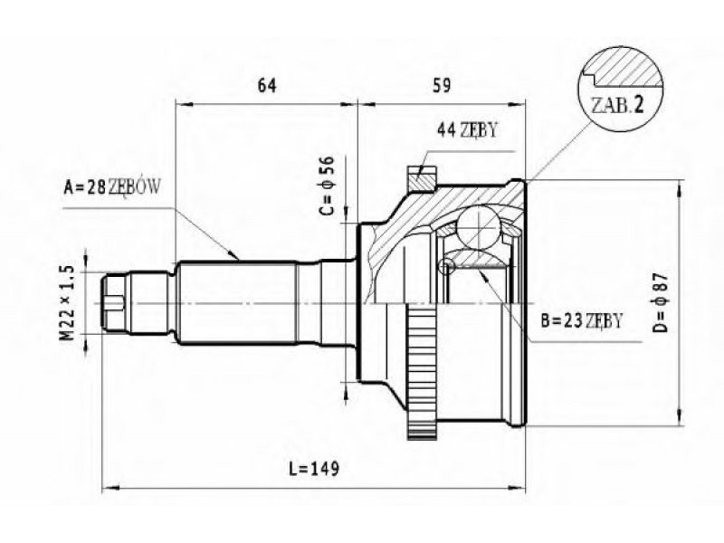montavimo vieta: rato pusė jungties tipas: CV sujungimas išorinis krumplys, rato pusė: 28 vidinis krumplys, rato pusė: 23 sandariklio skersmuo [mm]: 56 išorinis skersmuo [mm]: 87 krumplių skaičius, ABS žiedas: 44 |