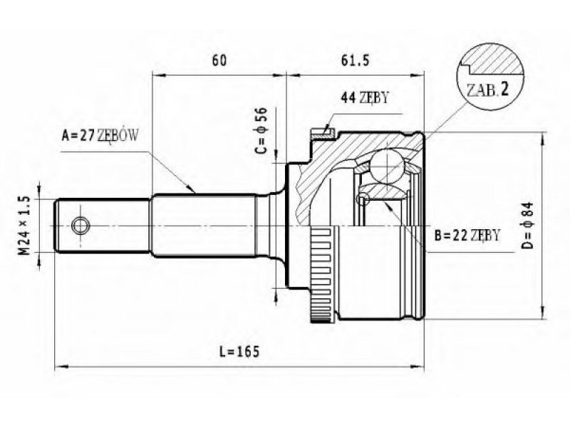 jungties tipas: CV sujungimas išorinis krumplys, rato pusė: 27 vidinis krumplys, rato pusė: 22 sandariklio skersmuo [mm]: 56 išorinis skersmuo [mm]: 84 krumplių skaičius, ABS žiedas: 44 |
