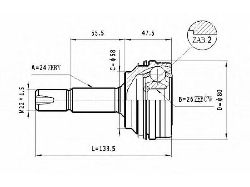 jungties tipas: CV sujungimas išorinis krumplys, rato pusė: 24 vidinis krumplys, rato pusė: 26 sandariklio skersmuo [mm]: 58 išorinis skersmuo [mm]: 80 |