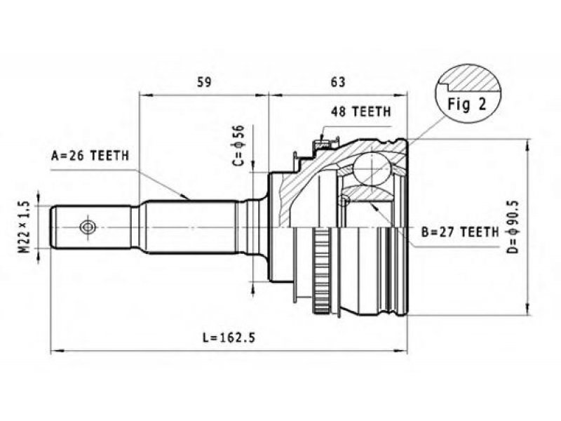 montavimo vieta: rato pusė jungties tipas: CV sujungimas išorinis krumplys, rato pusė: 26 vidinis krumplys, rato pusė: 27 sandariklio skersmuo [mm]: 56 išorinis skersmuo [mm]: 90,5 krumplių skaičius, ABS žiedas: 48 |
