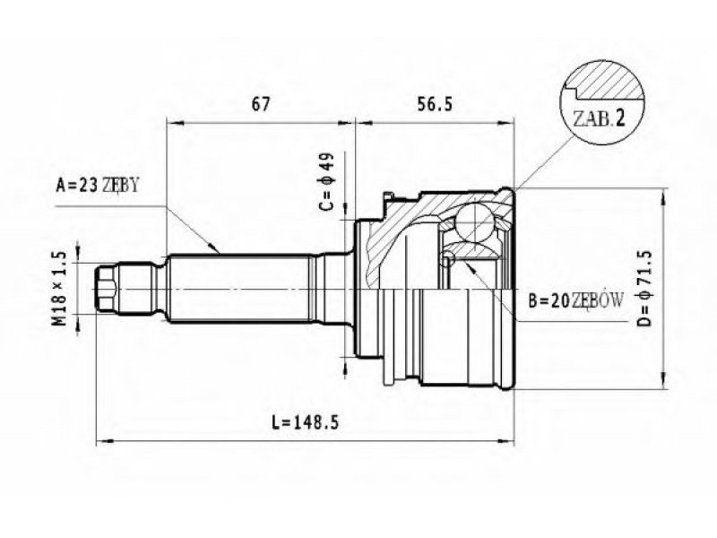 montavimo vieta: rato pusė jungties tipas: CV sujungimas išorinis krumplys, rato pusė: 23 vidinis krumplys, rato pusė: 20 sandariklio skersmuo [mm]: 49 išorinis skersmuo [mm]: 71,5 |