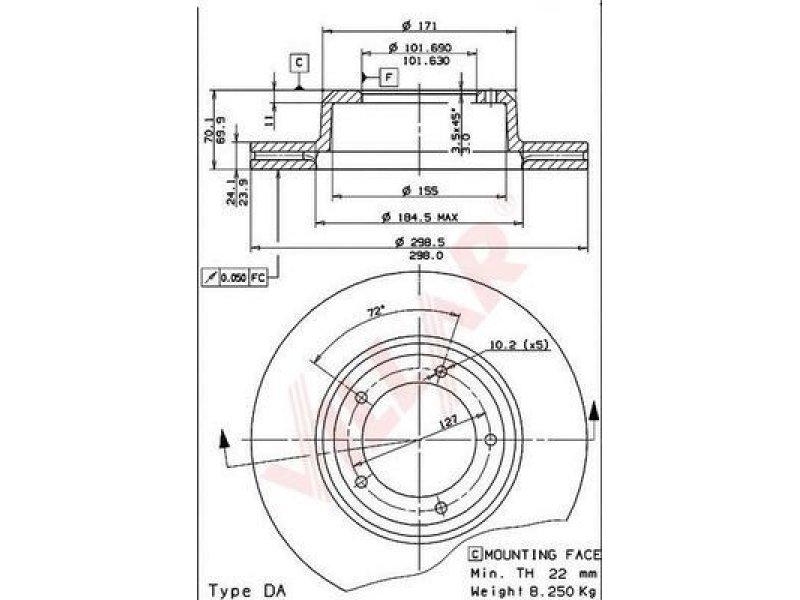 prekės numeriui: 628.1444 skersmuo [mm]: 298 aukštis [mm]: 70 stabdžių disko tipas: vidinis ventiliavimas stabdžių disko storis [mm]: 24 minimalus storis [mm]: 22 angų skaičius: 5 centravimo skersmuo [mm]: 101,6 užveržimo sukimo momentas [Nm]: 13 |