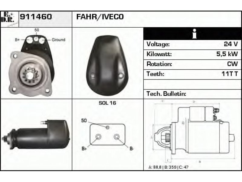 jungės Ø [mm]: 88,8 ilgis 1 / ilgis 2 [mm]: 359.0 / 47.0 įtampa [V]: 24 nustatyta galia [kW]: 5,5 sukimo kryptis: rotacija pagal laikrodžio rodyklę krumplių skaičius: 11 lizdo tipo ID: SOL16 srieginių angų skaičius: 0 montavimo angų skaičius: 3