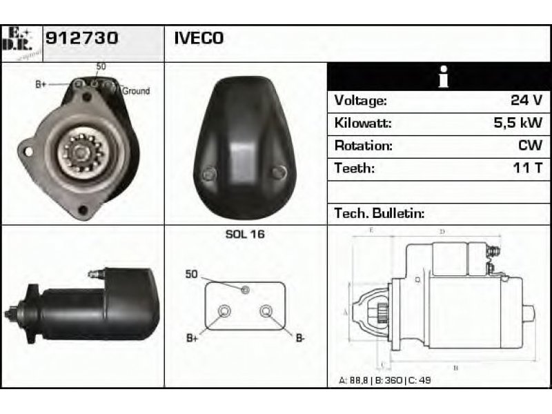 jungės Ø [mm]: 88,8 ilgis 1 / ilgis 2 [mm]: 360.0 / 48.0 įtampa [V]: 24 nustatyta galia [kW]: 5,5 sukimo kryptis: rotacija pagal laikrodžio rodyklę krumplių skaičius: 11 lizdo tipo ID: SOL16 srieginių angų skaičius: 0 montavimo angų skaičius: 3