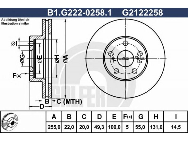 skersmuo [mm]: 255 stabdžių disko storis [mm]: 22 minimalus storis [mm]: 20 stabdžių disko tipas: ventiliuojama paviršius: padengta angų skaičius: 5 angos apskritimo skersmuo [mm]: 100 aukštis [mm]: 49,3 centravimo skersmuo [mm]: 55 vidinis skersmuo [mm]: 131 angos Ø [mm]: 14,5 |