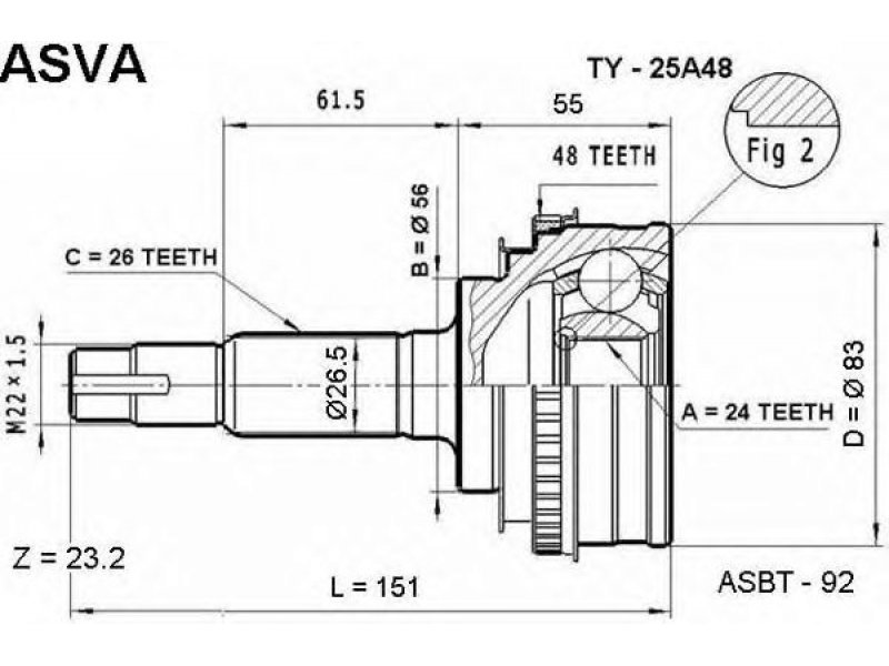 montavimo vieta: priekinė ašis jungties tipas: CV sujungimas vidinis krumplys, rato pusė: 24 išorinis krumplys, rato pusė: 26 sandariklio skersmuo [mm]: 56 krumplių skaičius, ABS žiedas: 48 skersmuo [mm]: 83