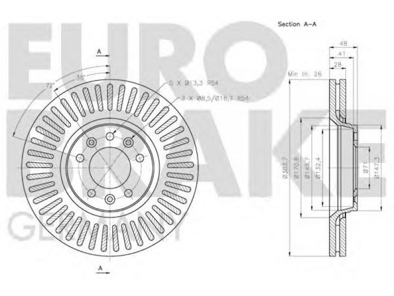 skersmuo [mm]: 304 aukštis [mm]: 48,5 svoris [kg]: 9,84 stabdžių disko tipas: ventiliuojama stabdžių disko storis [mm]: 28 minimalus storis [mm]: 26 centravimo skersmuo [mm]: 71 žiedų angų skaičius: 5 montavimo vieta: priekinė ašis