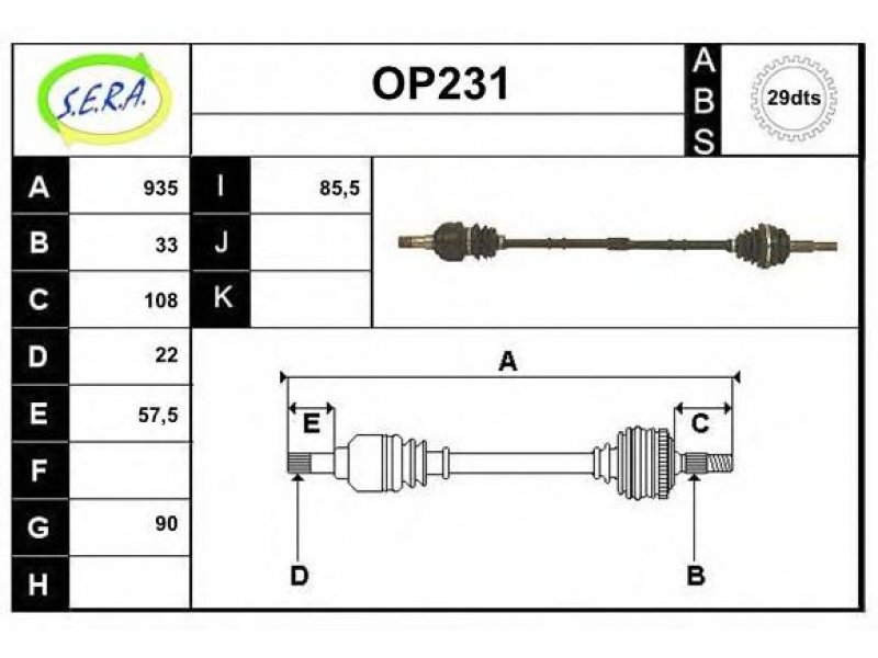 ilgis [mm]: 935 išorinis krumplys, rato pusė: 33 skersmuo 1 [mm]: 90 išorinis krumplys. kt. pusė: 22 skersmuo 2 [mm]: 85,5 krumplių skaičius: 29 stabdymas / važiavimo dinamika: transporto priemonėms su ABS kardaninis velenas: su ABS žiedu |